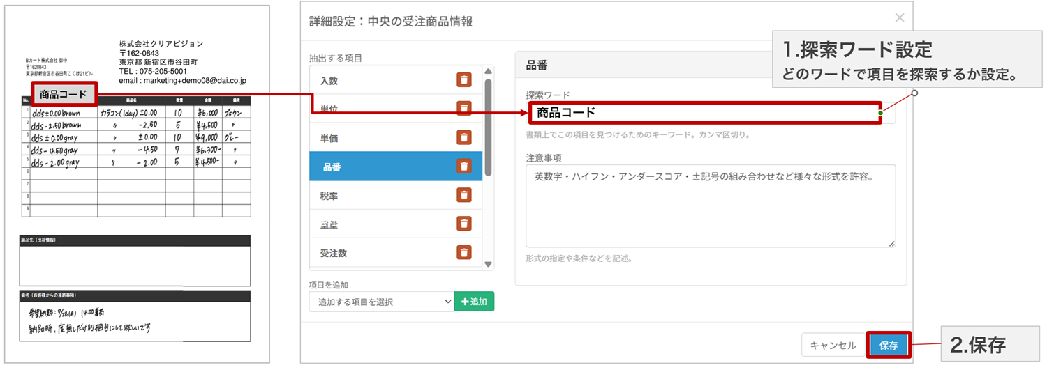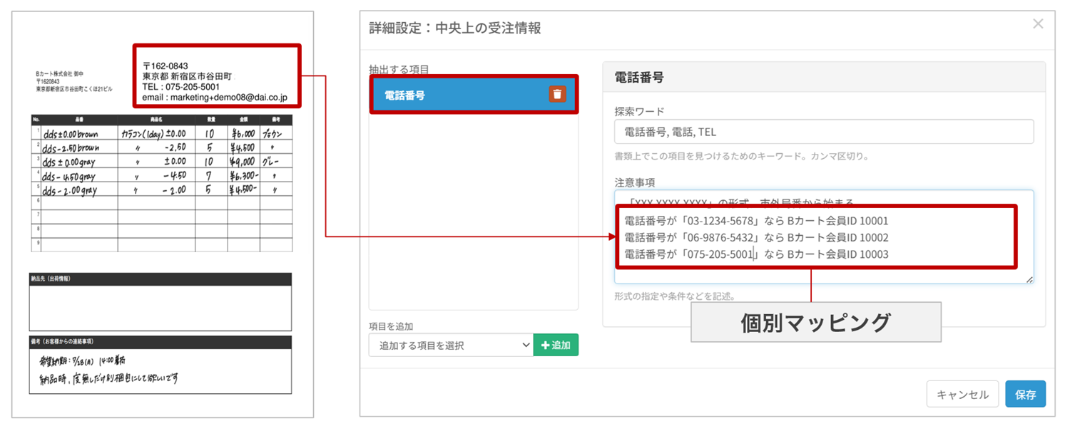 注文書にマスタ連携できる項目(会員ID、品番など)が記載されている場合、注文書内の項目とBカートのマスタ情報を探索ワードを使って紐づけます。