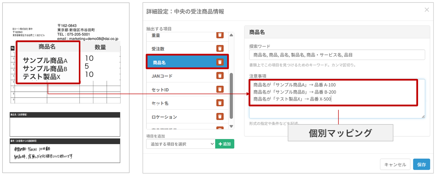 ・個別マッピングは、取引先が少数の場合や、注文書形式の変更が困難な場合の代替手段としてご活用ください