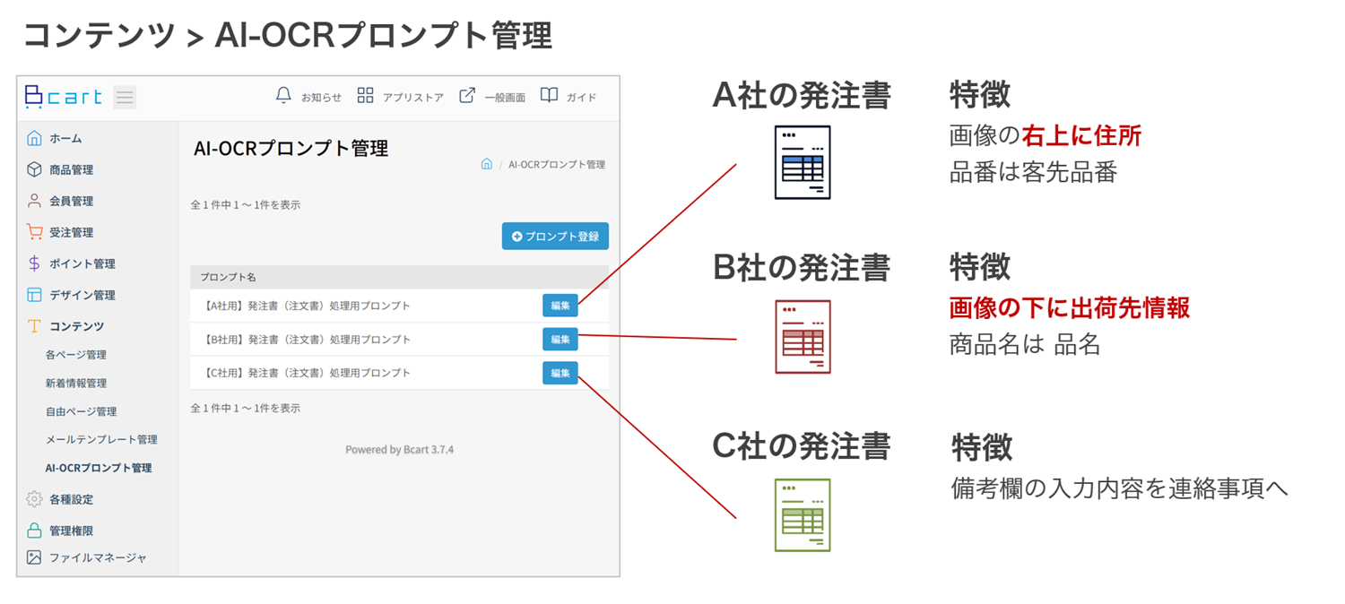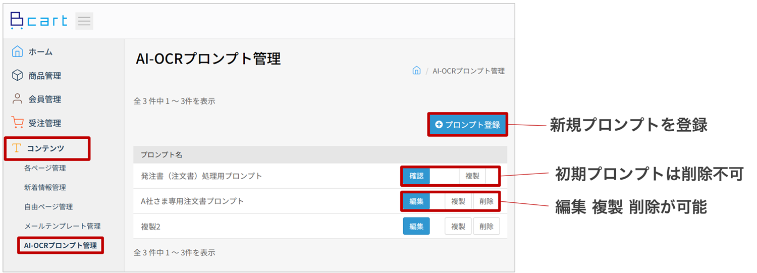 プロンプトの登録・管理は、管理画面の「コンテンツ > AI-OCRプロンプト管理」メニューから行います。