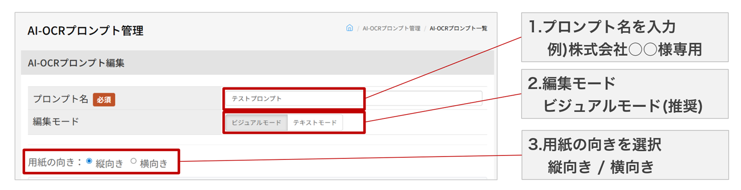 図3:プロンプト編集画面(プロンプト名、編集モード、用紙の向き設定)