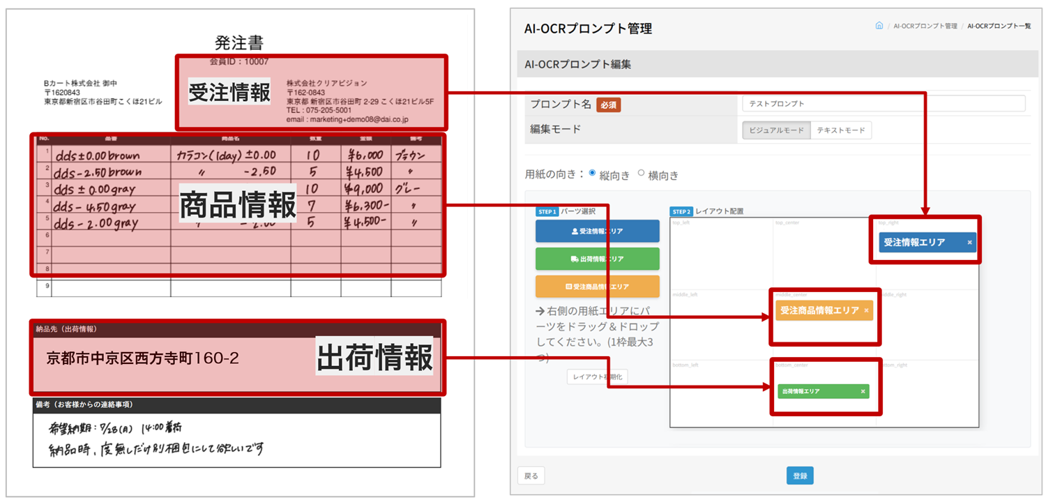 受注情報、配送先情報、商品明細など、それぞれのエリアを正確に指定することで、読み取り精度が向上します。