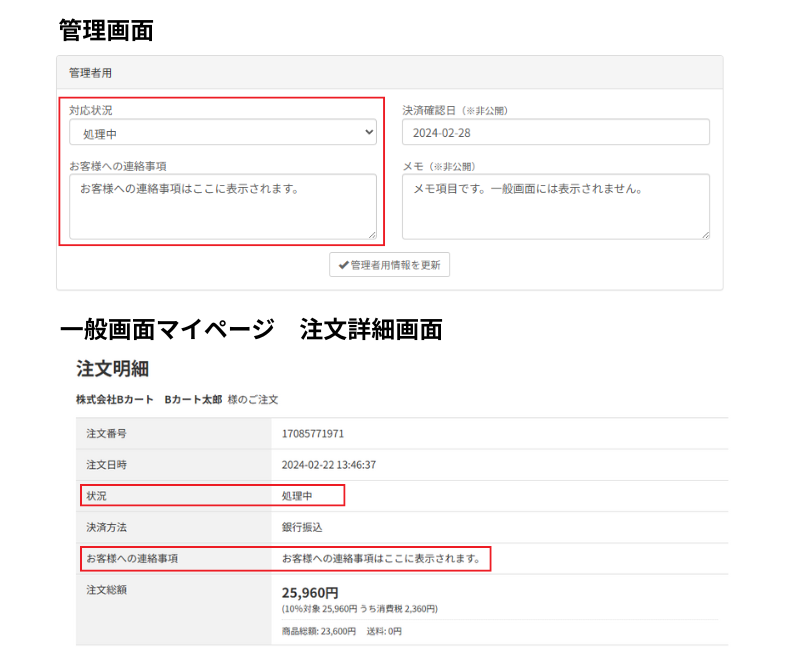 ※ (※非公開)の項目は、管理者画面でしか見れません。それ以外の項目は、一般画面マイページ受注詳細にて、会員自身で確認が可能です。